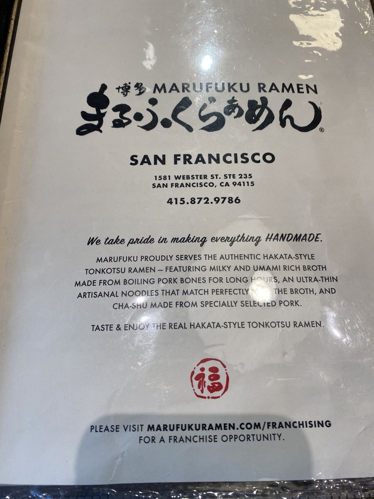Marufuku Ramen is a trendy ramen spot located in San Francisco's Japantown Mall. Offering a variety of ramen options, this restaurant is known for its flavorful and rich broth, perfectly cooked noodles, and tender chashu pork. The menu also includes appetizers like takoyaki and gyoza, which complement the main dishes well.
